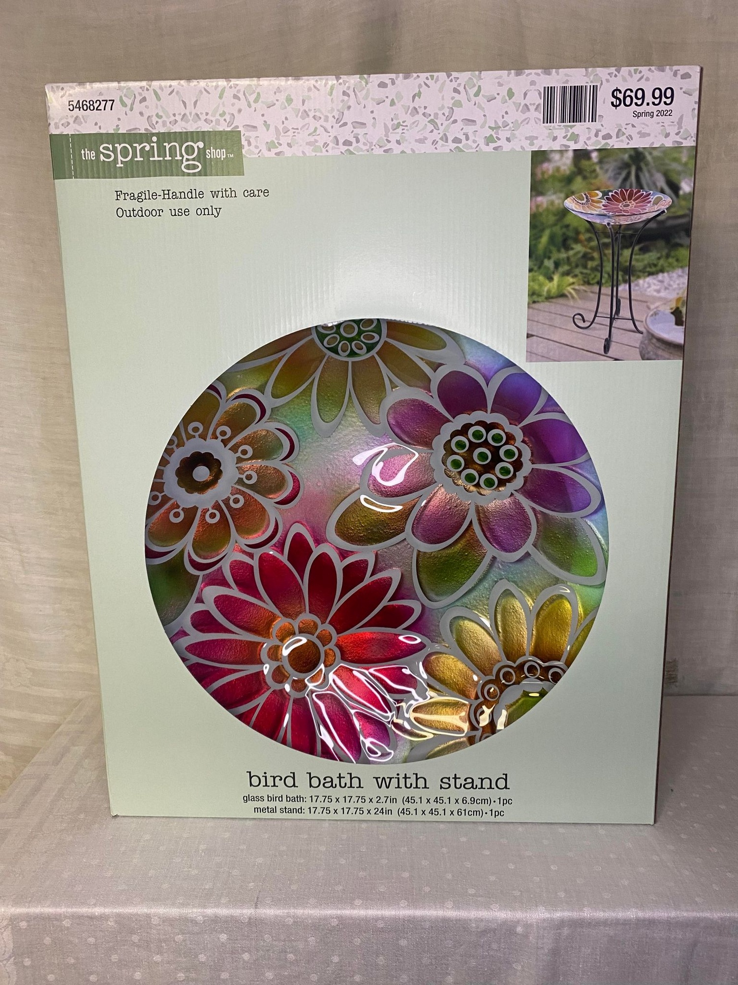 Beautiful colored glass bird bath WITH stand. Bird Bath measures - 17 3/4" x 17 3/4" x 2.7", Stand measures - 17 3/4" x 17 3/4" x 24"