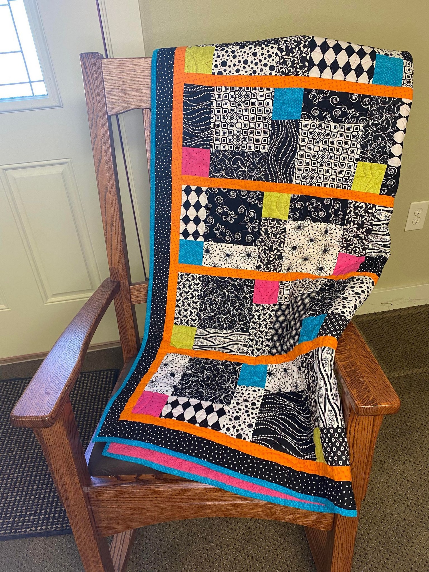 Beautiful quilt with a mixture of black & white with pops of color. Back of quilt is wonderfully finished with a soft fuzzy/fleece fabric making it extra cozy! Size 5' x 4'